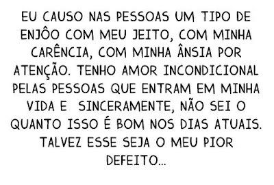 Sou uma otimista de carteirinha. Pode colocar aí no meu CPF: Caminho Para Felicidade. Eu sei que alguns vão torcer o nariz, outros não vão acreditar, mas eu ando em busca daquilo que acrescenta. As deficiências de todo o dia já são suficientes, não preciso dar minha dose de colaboração. Se for pra contribuir, que seja então para tirar o peso dos passos e dar leveza ao olhar.'